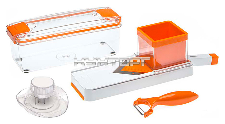 В комплект поставки входят слайсер с 2 функциями резки, круглый держатель для мелких и средних плодов, овощечистка для фруктов и овощей и контейнер для хранения продуктов.
