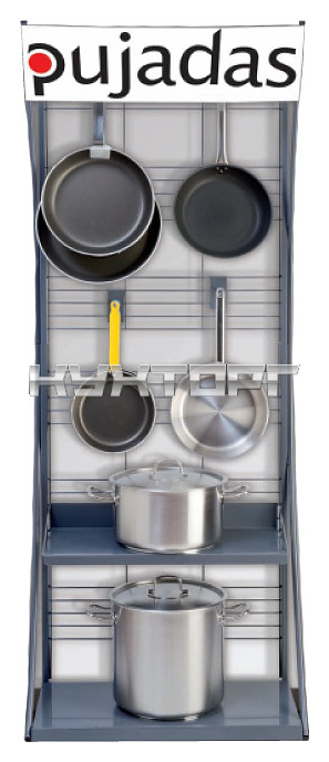 Стенд Pujadas 255.000 используется на предприятиях торговли для эффектной предпродажной демонстрации кухонного инвентаря. Модель оснащена решетчатой задней стенкой для размещения крючков и 2 сплошными полками.
