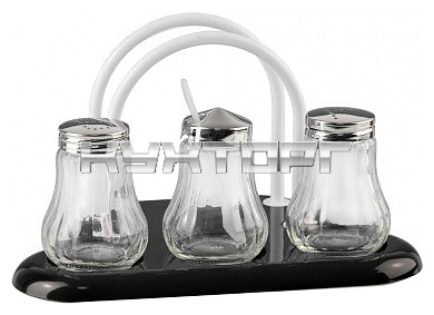 В набор входят солонка, перечница, горчичница, салфетница и подставка.