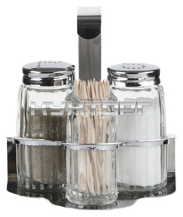 В набор входят солонка, перечница, стакан для зубочисток и подставка.
