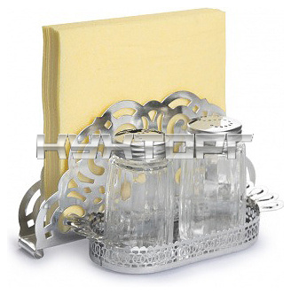 В набор входят солонка, перечница и подставка с салфетницей.
