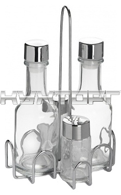В набор входят солонка, перечница, емкости для уксуса и масла и подставка.