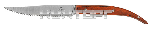 Нож для стейка Luxstahl 235 мм с зубцами, коричневая ручка используется на предприятиях общественного питания и торговли, в частных домах и квартирах. Лезвие выполнено из нержавеющей стали 3Cr13, рукоять - из дерева коричневого цвета.
