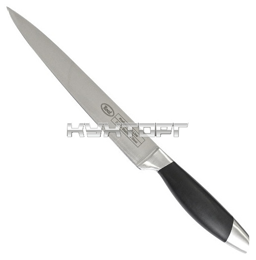 Нож ROAL CHEF HL-F056-3 используется на предприятиях общественного питания и в домашних условиях для нарезки мяса. Модель оснащена лезвием с лазерной заточкой и обтекаемой рукояткой с ограничителем у основания для безопасного захвата. Клинок выполнен из нержавеющей стали SS430, лезвие – из высококачественной нержавеющей стали SS 3Cr13, рукоятка с накладкой из полиуретана черного цвета и металлическим наконечником.