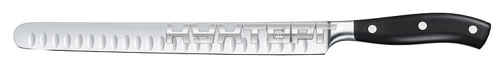 Нож Victorinox 7.7223.26 (04070249) Grand Maitre используется для нарезания тонкими ломтиками запеченных мяса, птицы, мясных полуфабрикатов и аналогичных продуктов на предприятиях общественного питания и в домашних условиях. Модель оснащена лезвием с прямой режущей кромкой и округлым наконечником. Кованый клинок выполнен из высококачественной мартенситной нержавеющей стали, рукоятка – из ударопрочного полимера – полиоксиметилена (POM) черного цвета.
