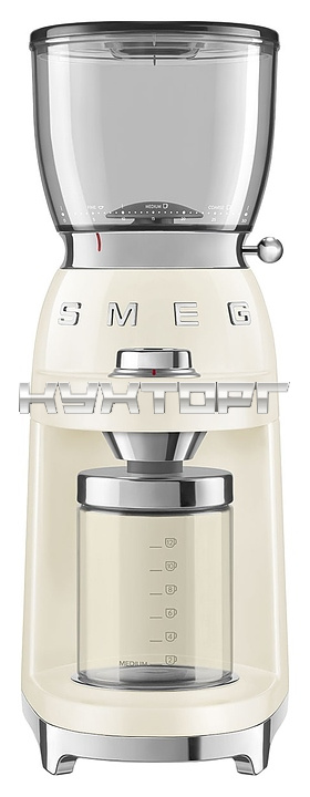 Кофемолка SMEG CGF11CREU предназначена для приготовления молотого кофе из зерен в гостиницах, офисах и домашних условиях. Модель оснащена интегрированной подставкой для емкости с готовым продуктом, кабелем питания с вилкой и электромеханическим управлением. Корпус выполнен из нержавеющей стали с глянцевым внешним покрытием кремового оттенка и накладными объемными серебристыми литерами логотипа, жернова – из нержавеющей стали, рукоятка рычага – из стали SUS304 с серебристой поверхностью, основание, регулировочная ручка, крышка контейнера – из пластика с хромированной поверхностью, бункер и контейнер – из высокопрочного полимера Tritan Renew без содержания вредных компонентов, крышка бункера, подставка для холдера (держателя фильтра) и щетка – из пластика, изоляция кабеля серого цвета.