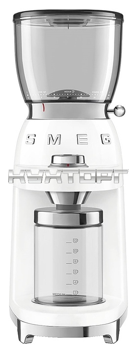 Электрическая кофемолка SMEG CGF11WHEU предназначена для приготовления молотого кофе из зерен в гостиницах, офисах и домашних условиях. Модель оснащена интегрированной подставкой для емкости с готовым продуктом, кабелем питания с вилкой и электромеханическим управлением. Корпус выполнен из нержавеющей стали с глянцевым внешним покрытием белого цвета и накладными объемными серебристыми литерами логотипа, жернова – из нержавеющей стали, рукоятка рычага – из стали SUS304 с серебристой поверхностью, основание, регулировочная ручка, крышка контейнера – из пластика с хромированной поверхностью, бункер и контейнер – из высокопрочного полимера Tritan Renew без содержания токсичных компонентов, крышка бункера, подставка для холдера (держателя фильтра) и щетка – из пластика, изоляция кабеля серого цвета.