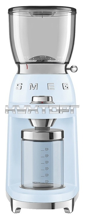 Электрическая кофемолка SMEG CGF11PBEU предназначена для приготовления молотого кофе из зерен в гостиницах, офисах и домашних условиях. Модель оснащена интегрированной подставкой для емкости с готовым продуктом, кабелем питания с вилкой и электромеханическим управлением. Корпус выполнен из нержавеющей стали с глянцевым внешним покрытием пастельного голубого оттенка и накладными объемными серебристыми литерами логотипа, жернова – из нержавеющей стали, рукоятка рычага – из стали SUS304 с серебристой поверхностью, основание, регулировочная ручка, крышка контейнера – из пластика с хромированной поверхностью, бункер и контейнер – из высокопрочного полимера Tritan Renew без содержания токсичных компонентов, крышка бункера, подставка для холдера (держателя фильтра) и щетка – из пластика, изоляция кабеля серого цвета.