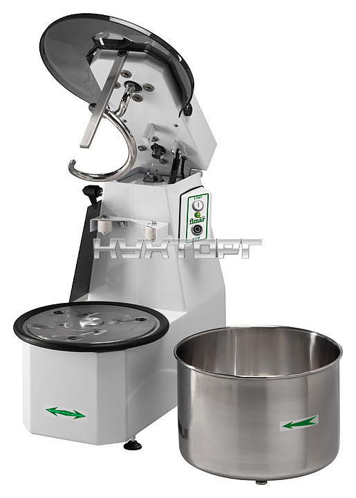 съемная дежа на 32 литра(ов), подъемная траверса, загрузка 25 кг, производительность 75 кг/ч, 380 В, 1.5 кВт, скоростей 1 |