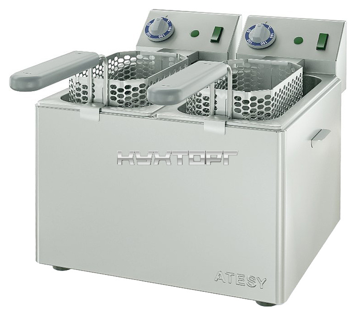 Электрофритюрница ATESY Панда-ЕВРО-2х1/3 используется на предприятиях общественного питания и торговли для приготовления различных видов продуктов в разогретом масле (фритюре). Модель оснащена 2 терморегуляторами и 4 индикаторными лампами. Изделие и сетки для загрузки продуктов полностью выполнены из пищевой нержавеющей стали, ручки сеток - из "холодного" пластика.