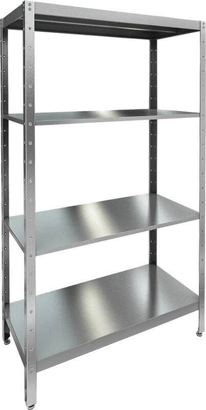 полки - сплошные; 4 полки; от 50 до 100 кг; каркас - оцинкованная сталь; полки - нерж. сталь; ширина - 1800 мм; глубина |