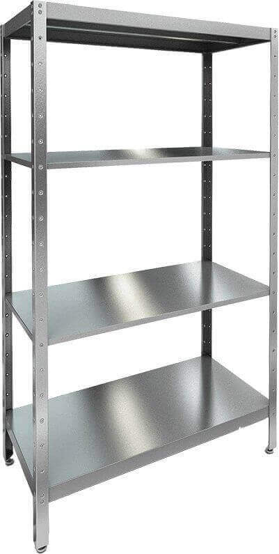 Стеллаж оснащен 4 полками из шлифованной нержавеющей стали 430. Стойки из оцинкованного уголка 30х30 мм комплектуются регулируемыми опорами.