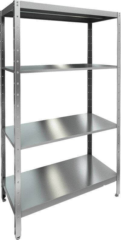 полки - сплошные; 4 полки; от 50 до 100 кг; каркас - оцинкованная сталь; полки - нерж. сталь; ширина - 1400 мм; глубина |