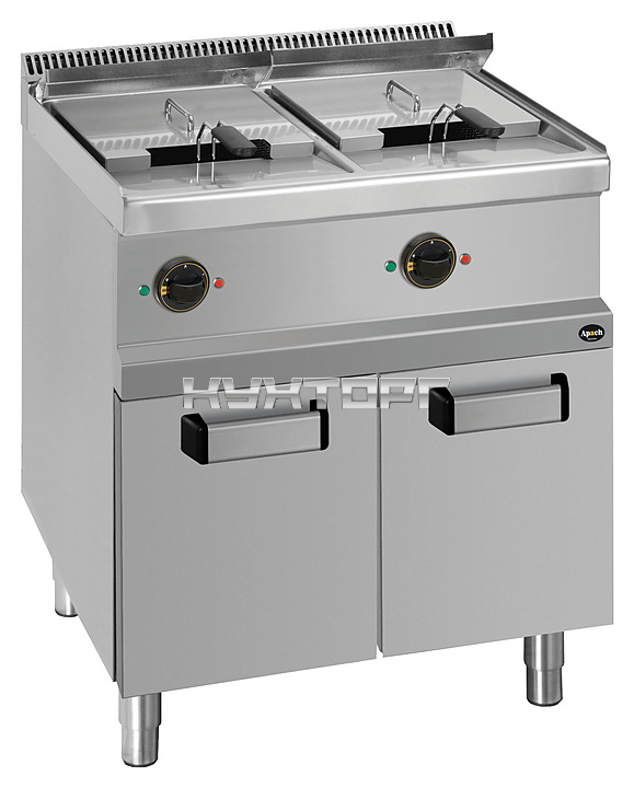Фритюрница Apach APFE-77P 700-й серии предназначена для приготовления блюд в масле на предприятиях общественного питания и торговли. Модель оснащена электромеханической панелью управления и закрытой подставкой с регулируемыми по высоте ножками. Во фритюрнице предусмотрена холодная зона, что позволяет увеличить время использования масла. Корпус, ванны, рабочая поверхность, панель управления и вытяжная решетка выполнены из нержавеющей стали AISI 304, боковые и задняя панели - из нержавеющей стали AISI 430, корзины - из хромированной стальной проволоки, нагревательные элементы, фильтры и крышки корзин - из нержавеющей стали.